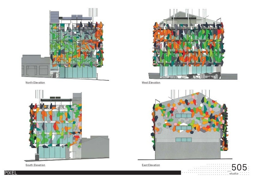 Studio 505 were approached by Grocon to design the Development Office (Pixel), the last building to be conceived on the site, and yet the first to be built. Pixel also claims the other two extremes, namely being the smallest building with the biggest expectations.